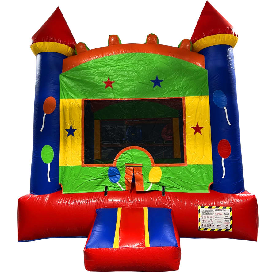This colorful stars with balloons castle bouncy house is a sanitized, affordable moonwalk that has hours of fun for kids and adults. Its greats for all ages, that can hold up to 12 kids at a time and fits any theme perfect for any event like birthday parties, school and church events and more. This colored castle is very popular so take advantage and rent this amazing inflatable today!