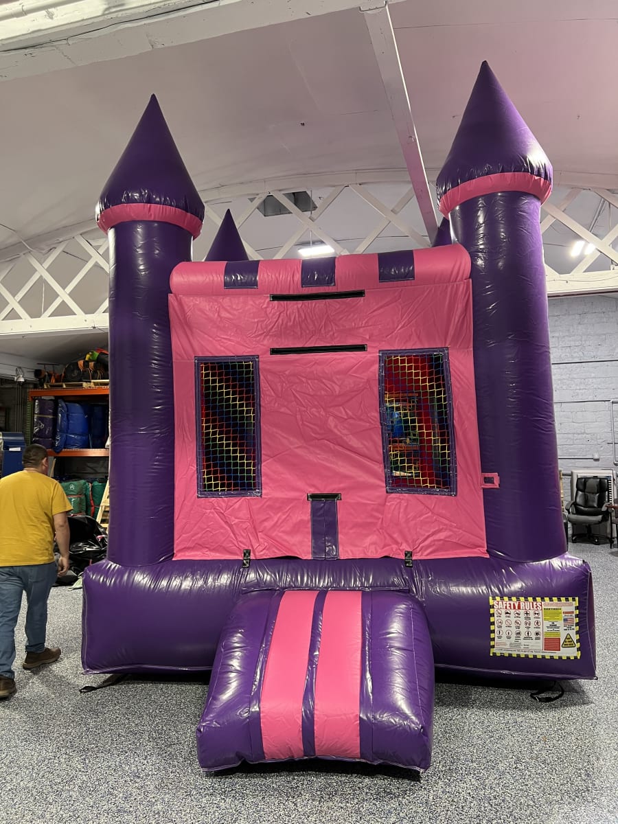 This colorful 12x12 Pink castle bouncy house is a sanitized, affordable moonwalk that has hours of fun for kids and adults. Its greats for all ages, that can hold up to 10 kids at a time and fits any theme perfect for any event like birthday parties, school and church events and more. This pink and purple castle is very popular so take advantage and rent this amazing inflatable today!