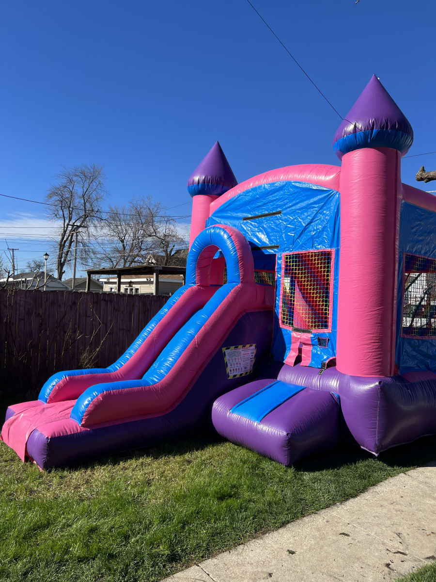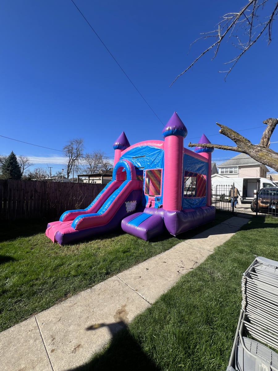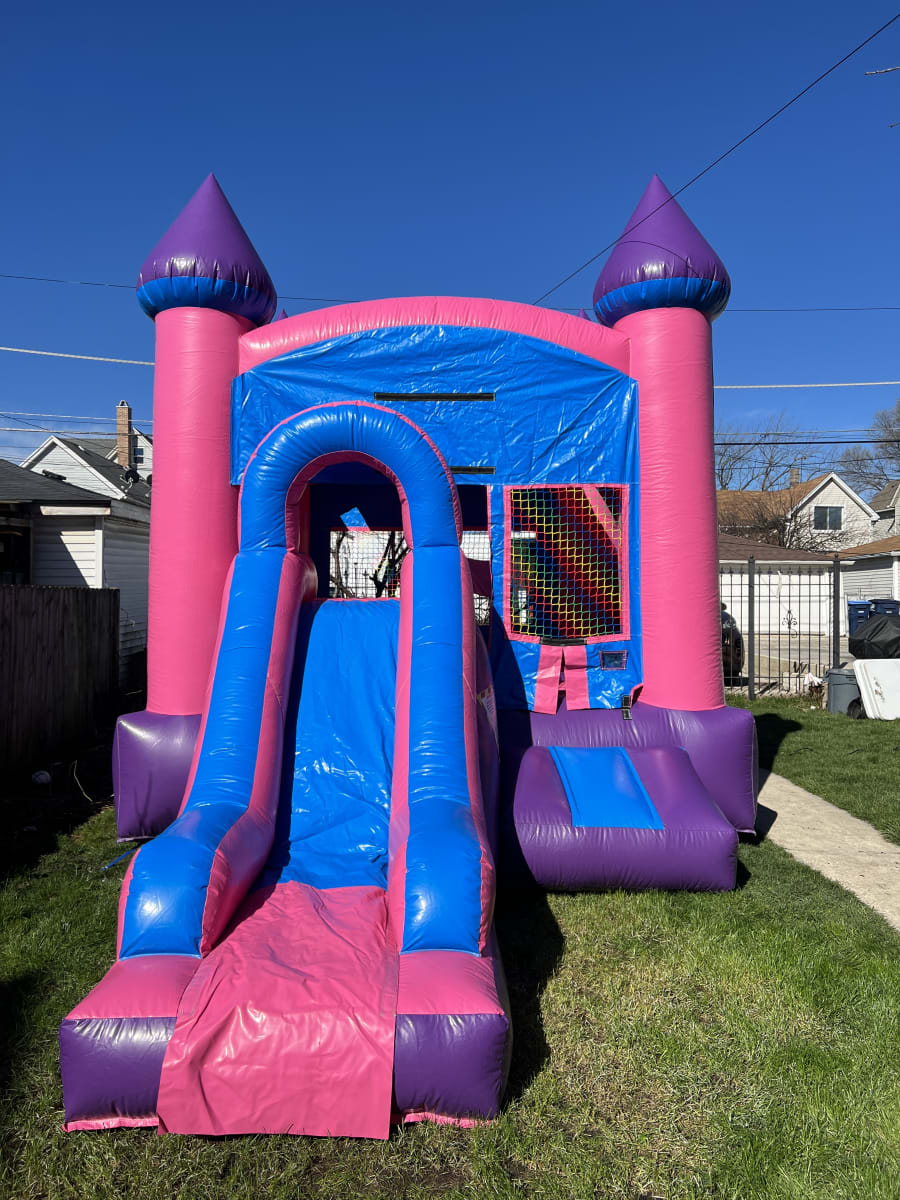 This colorful pink and purple princes castle bouncy house is a sanitized, affordable moonwalk that has hours of fun for kids and adults. With a variety of fun of bouncing and sliding. Its greats for all ages, that can hold up to 14 kids at a time, and fits any girl theme or perfect for any event like birthday parties, school and church events and much more. This pink and purple combo castle is very popular so take advantage and rent this amazing inflatable today!
