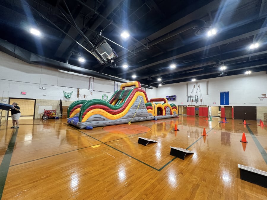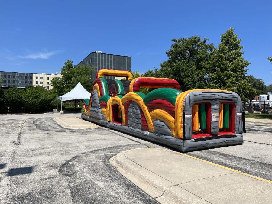 This neutral colored 55 foot long obstacle course is a sanitized, affordable moonwalk that has hours of fun for kids and adults. It has a variety of fun like crawling through tunnels, fighting with pop ups, and a rock climb to slide down to the finish line. Its greats for all ages, that can hold up to 17 kids at a time, and fits any theme and is perfect for any event like, birthday parties, school and church events and much more. This Extreme Rush obstacle course is very popular so take advantage and rent this amazing inflatable today!