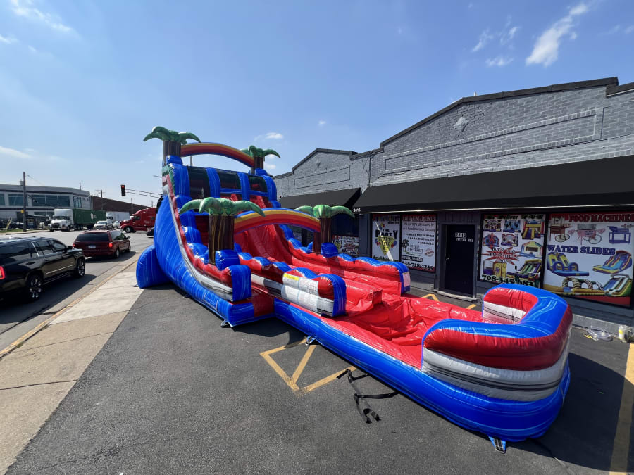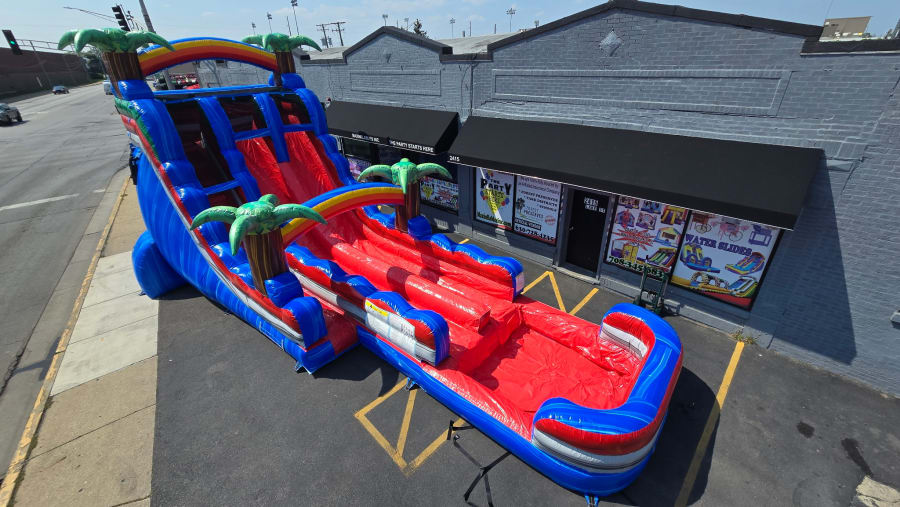 🌴🌈 Make your next event unforgettable with the Tropical Rainbow Double Waterslide—the most exciting and visually stunning double waterslide in Melrose Park and surrounding areas! Standing a thrilling 18 feet tall and stretching a massive 40 feet in length, this inflatable waterslide is designed for pure enjoyment and safe fun for guests of all ages. Whether you’re planning a birthday party, family reunion, or community event, this vibrant attraction guarantees hours of laughter and excitement.